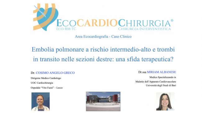 Iniziamo il nuovo anno con un interessantissimo caso clinico a cura dei dottori Cosimo Angelo Greco e Miriam Albanese dal titolo Embolia polmonare a rischio intermedio-alto e trombi in transito nelle sezioni destre: una sfida terapeutica? Buona visione! Lo Staff di EcoCardioChirurgia®